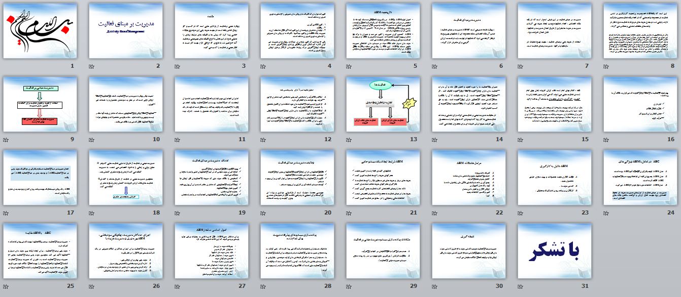 در این بخش پاورپوینت مدیریت بر مبنای فعالیت(ABM) در 31 اسلاید برای دانلود قرار داده شده است. در ذیل پیشنمایشی از آن آورده شده است.